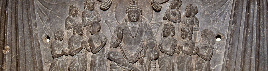 The starting point for this discussion is a group of Gandharan narrative relief sculptures with a Bodhisattva in the center sitting in meditation (padmāsana) below an umbrella or canopy on a throne with a footstool. He performs the gesture of fearlessness (abhayamudrā) with his right hand and holds a flask (kalaśa, kamaṇḍalu) in the left. He is attended by seated figures, mostly wearing turbans, of which at least one is usually portrayed in a vague attitude of conversation or discussion.