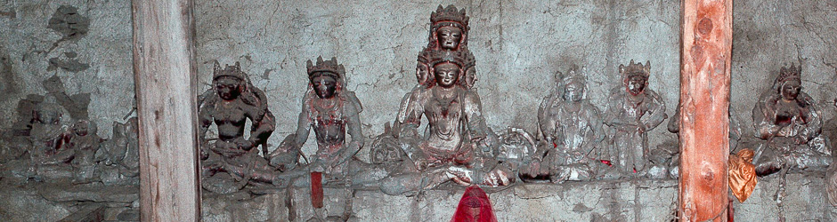 Eleven of the clay sculptures are placed on a comparatively narrow ledge (only about 35 cm deep) along the back wall. One goddess, seated on the ground in front of the ledge, is surrounded by other fragmentary remains of sculptures and their frames. The comparatively small size of the images and the relative differences in size between them suggest that the original composition resembled that at Lalung, Alchi etc., and covered the main wall (◊ Gumrang Sculptures).