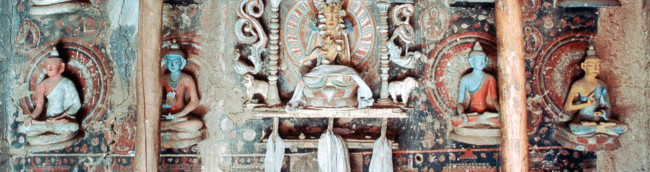 The configuration of sculptures on the main wall of the Upper Temple is unique (◊ Main Wall). There, the crudely restored main image, most likely to be identified again as the goddess Prajñāpāramitā, is flanked by eight Buddhas. The sculptures have been restored so often that their original appearance can only be guessed (◊ Sculptures). However, as their relationship to the surrounding original murals proves, these sculptures, too, are contemporaneous with the paintings. Comparable mandalas dedicated to Prajñāpāramitā are known from a number of roughly contemporaneous monuments, but only here the goddess is flanked only by Buddhas.