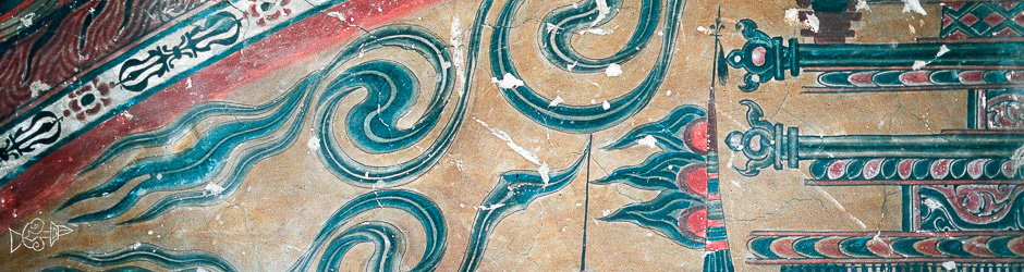 The Lhakhang Gongma (ལྷ་ཁང་གོང་མ་) or Upper Temple is a small square room measuring ca. 5.5 x 5.5 metres, with a height of 4.6 metres. Despite its precarious condition the temple preserves much of it’s original interior decoration on all walls. The main wall is mostly covered in sculptures, consisting of a central, clumsily restored female image within an elaborate throne frame flanked by eight Buddhas. As in the Main Temple each side wall is occupied by a single mandala, both a variant of the Vajradhātu mandala. Remarkable features here are the colourful decorative lotus scrolls and scarves to the sides and in the corners of the mandalas. Of the two clay gate-keepers which once flanked the entrance, only the painted fiery mandorlas remain, together with considerable portions of murals. Most remarkable among these paintings on the entrance wall is the depiction of of the Four Great Kings above the door.