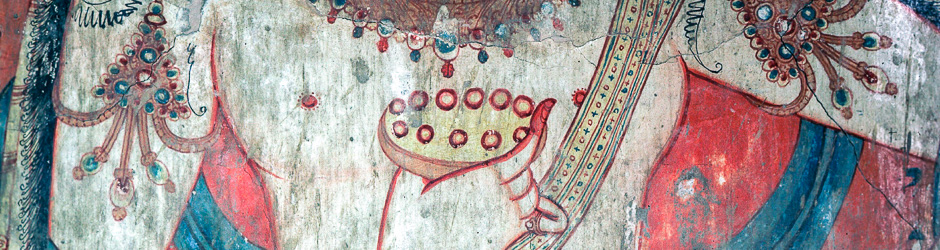 In some places, in particular on the south side of the Ambulatory, the original paint layer is visible underneath the renovation period murals. From these traces it appears that the iconography of the original decoration was very similar to that of the renovation, but the Bodhisattvas represented on the side walls were standing and there was no narrative underneath them (◊ Original Paint Layer).