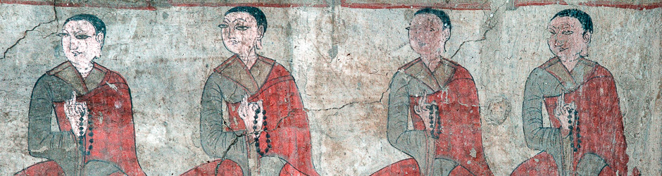 The Tabo Entry Hall (Gokhang སྒོ་ཁང་) is a small, earth-coloured room dominated by two crudely made gatekeepers, but it contains one of the most fascinating treasures of early Tibetan art and history. The fragmentary remains of murals going back to the foundation of the temple include two inscribed assemblies of historical personages. In addition the Entry Hall contains a rich array of pan-Indian protective deities, fragments of a Wheel of Life, and a depiction of the cosmos. The paintings preserved here can be attributed to the foundation of the temple in late 10th century (c. 996 CE).