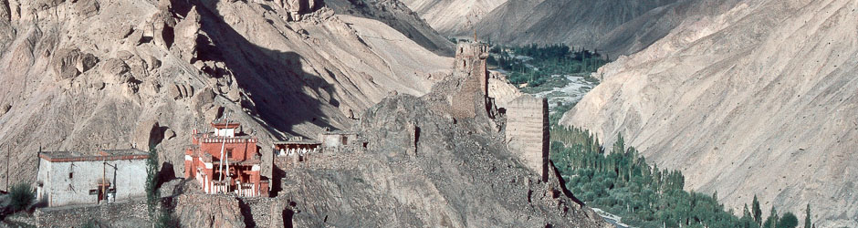 Wanla is a village in lower Ladakh located at the confluence of two streams in a side valley between Khaltse and Lamayuru. The village houses are sited on the slopes around a prominent rock hill that once boasted an impressive castle but is today dominated by the lofty structure of the three-storeyed Wanla temple. Of the castle, which was founded by the Ladakhi King Lhachen Ngaklug (ལྷ་ཆེན་ངག་ལུག་) in a tiger year of the 12th century, only ruins remain. According an inscription, the Tashi Sumtsek of Wanla was erected at the centre of the castle by a certain Bhakdarskyap (འབྷག་དར་སྐྱབ་), the eldest son of a minister of an unnamed government. This occurred most probably in the late 13th or early 14th century, an otherwise obscure period of Ladakhs history.